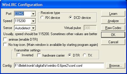 Setting of the software: Install WinLIRC, start. Go to Configure, set COM2, enter a new configuration file at Config.